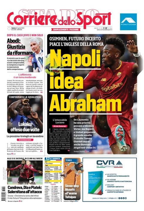 Il Corriere dello Sport, nell'edizione campana, apre parlando dell'interesse da parte del Napoli per Abraham e Boniface, due possibili sostituti di Osimhen in caso di addio a fine stagione: "Napoli, idea Abraham. Osimhen, futuro incerto: piace l'inglese della Roma. De Laurentiis ha una priorità: provare a blindare Victor, ma Bayern e United preparano il grande assalto. Si studia Tammy. Giuntoli segue anche Boniface, 20 gol nell'Union SG".