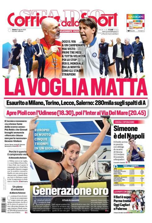 Il Corriere dello Sport, nell'edizione campana, apre con l'arrivo al Napoli di Giovanni Simeone: "Simeone è del Napoli. Il Cholito arriva in prestito con obbligo di riscatto. Al Verona 15,5 milioni, ora assalto a Raspadori".