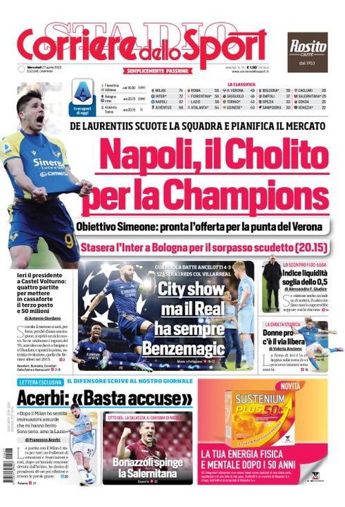 Il Corriere dello Sport, nell'edizione campana, apre con l'interesse da parte del Napoli per Giovanni Simeone dell'Hellas Verona in vista della prossima stagione: "Napoli, il Cholito per la Champions. De Laurentiis scuote la squadra e pianifica il mercato. Obiettivo Simeone: pronta l'offerta per la punta del Verona".