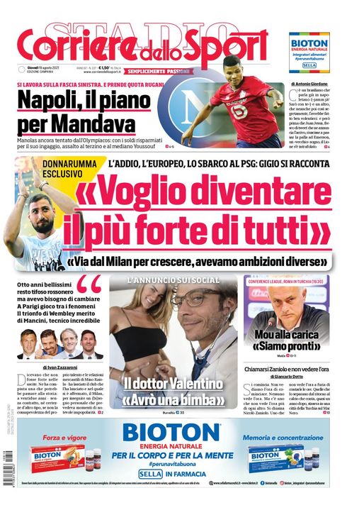 "Napoli, il piano per Mandava", titola l'edizione campana del Corriere dello Sport in riferimento alla trattativa per la fascia sinistra azzurra. Poi spazio all'intervista a Gigio Donnarumma: "Voglio diventare il più forte di tutti".