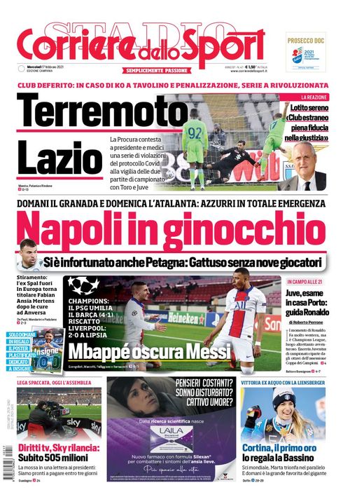 "Napoli in ginocchio", questo è il titolo di apertura della prima pagina del quotidiano Il Corriere dello Sport, edizione Campania. "Domani il Granada e domenica l'Atalanta: azzurri in totale emergenza. Si è infortunato anche Petagna: Gattuso senza nove giocatori".