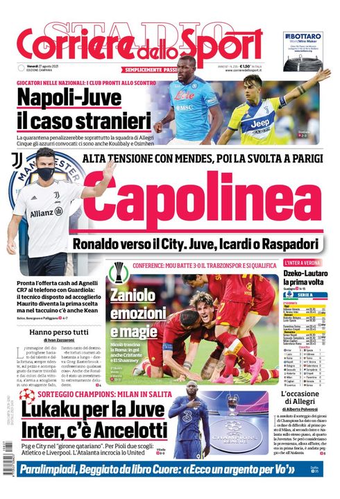 "Napoli-Juve, il caso stranieri", titola il Corriere dello Sport edizione Campania, in riferimento alla quarantena che farebbero i calciatori di ritorno dalle Nazionali, qualora accettassero la convocazione, e ciò impedirebbe loro di partecipare al match. A centro pagina spaizo all'addio probabile di CR7 alla Juventus con direzione Manchester City: "Capolinea".