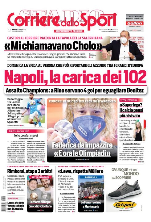 "Napoli, la carica dei 102", titola così la prima pagina del quotidiano Il Corriere dello Sport edizione Campania. "Assalto Champions, a Rino servono quattro gol per eguagliare Benitez. Domenica la sfida al Verona che può riportare gli azzurri tra i grandi d'Europa. Ballottaggio tra Lozano e Politano per una maglia. Allenatore: ADL aspetta, Allegri prima alternativa a Spalletti".