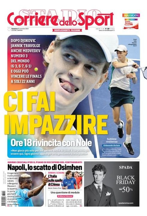 Il Corriere dello Sport, nell'edizione campana, apre con Jannik Sinner "Ci fai impazzire". Dopo Djokovic, Jannik travolge anche Medvedev numero 3 al mondo (6-3, 6-7, 6-1) e oggi può vincere le Finals a soli 22 anni. Ore 18 rivincita con Nole: "Non gioco più per me, penso anche ai tifosi. E' un privilegio essere qui. Ogni giorno aggiungo un ingrediente al mio piatto". In basso, "Napoli, lo scatto di Osimhen". Giorni cruciali per il piano di recupero del centravanti. Il nigeriano vuole provare a rientrare sabato a Bergamo: Mazzarri lo aspetta. In porta giocherà ancora Gollini. A sinistra c'è Olivera. Spazio anche alla Nazionale con "L'Italia sulle spalle di Chiesa". Domani c'è l'Ucraina.