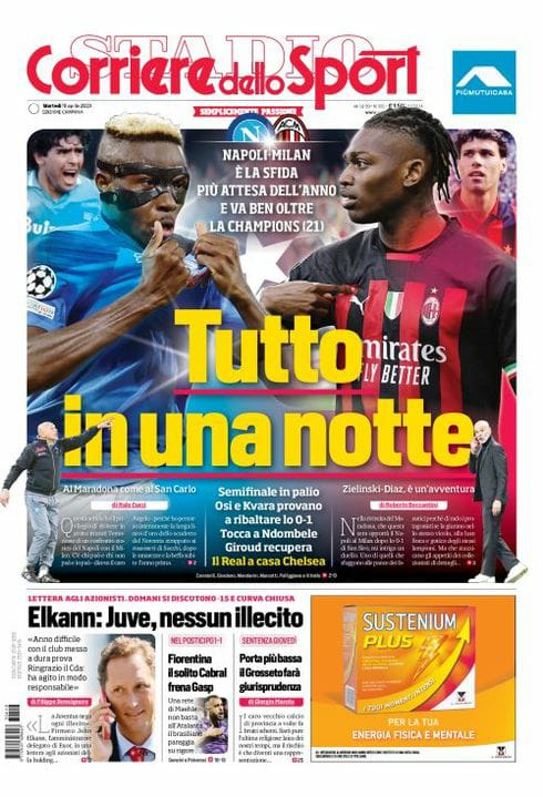 Il Corriere dello Sport, nell'edizione campana, apre con "Tutto in una notte". Napoli-Milan è la sfida più attesa dell'anno e va ben oltre la Champions (21). Semifinale in palio. Osi e Kvara provano a ribaltare lo 0-1. Tocca a Ndombele, Giroud recupera. "Al Maradona come al San Carlo". "Zielinski-Diaz, è un'avventura".