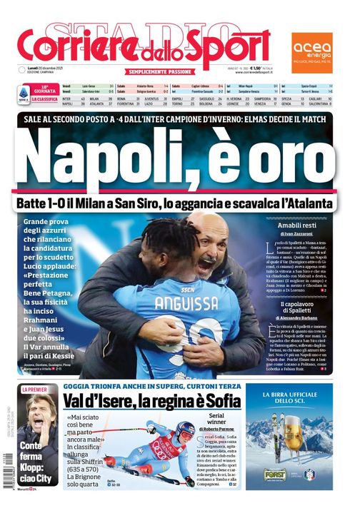 Il Corriere dello Sport, edizione Campania, dedica la prima pagina alla vittoria del Napoli contro il Milan nel big match dello Stadio San Siro: "Napoli, è oro. Sale al secondo posto a -4 dall'Inter campione d'inverno: Elmas decide il match. Batte 1-0 il Milan a San Siro, lo aggancia e scavalca l'Atalanta".