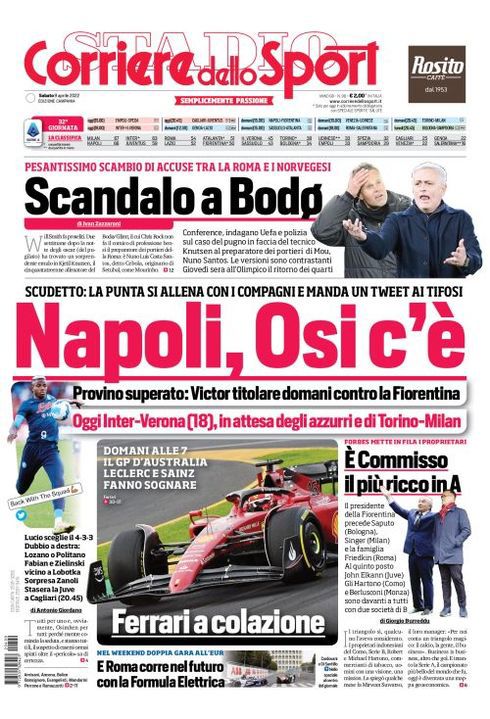 Il Corriere dello Sport, nell'edizione campana, apre con il ritorno in gruppo di Victor Osimhen dopo i fastidi muscolari accusati nei giorni scorsi: "Napoli: Osi c'è. Provino superato: Victor titolare domani contro la Fiorentina. Scudetto: la punta si allena con i compagni e manda un tweet ai tifosi".