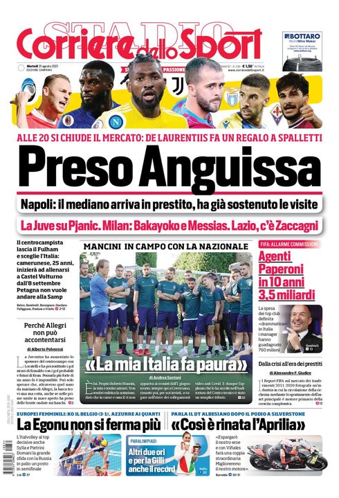 Il Corriere dello Sport, nella sua edizione Campania, apre in prima pagina con il calciomercato del Napoli: “Napoli: il mediano arriva in prestito, ha già sostenuto le visite. Il centrocampista lascia il Fulham e sceglie l’Italia: camerunese, 25 anni, inizierà ad allenarsi a Castel Volturno dall’8 settembre. Petagna non vuole andare alla Samp”. Spazio anche alle altre trattative: "La Juve su Pjanic. Milan: Bakayoko e Messias. Lazio, c'è Zaccagni". Al centro le parole di Roberto Mancini, commissario tecnico dell'Italia e di spalla l'inchiesta della Fifa sulle commissioni.
