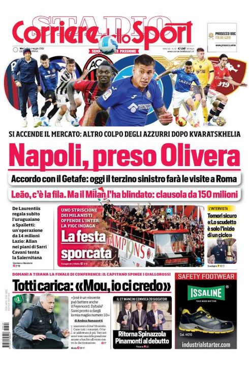 Il Corriere dello Sport, nell'edizione campana, apre con "Napoli, preso Olivera". Si accende il mercato: altro colpo degli azzurri dopo Kvaratskhelia. Accordo con il Getafe: oggi il terzino sinistro farà le visite mediche a Roma. De Laurentiis regala subito l'uruguaiano a Spalletti: un'operazione da 14 milioni. Lazio: Allan nei piani di Sarri. Cavani tenta la Salernitana.
