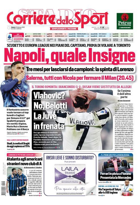 Il Corriere dello Sport, nell'edizione campana, apre parlando degli obiettivi che vorrebbe raggiungere il capitano azzurro Lorenzo Insigne prima dell'addio al Napoli a fine stagione: "Napoli, quale Insigne. Scudetto e Europa League nei piani del capitano, prima di volare a Toronto. Tre mesi per lasciarsi da campioni: la spinta di Lorenzo".
