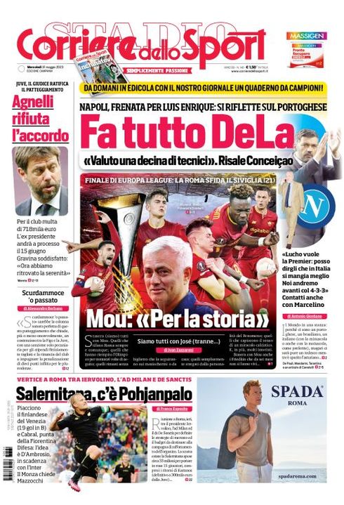 Il Corriere dello Sport, nell'edizione campana, apre parlando del futuro della panchina del Napoli: "Fa tutto DeLa: "Valuto una decina di tecnici". Risale Conceicao. Napoli, frenata per Luis Enrique: si riflette sul portoghese. "Lucho vuole la Premier: posso dirgli che in Italia si mangia meglio. Noi andremo avanti col 4-3-3". Contatti anche con Marcelino".