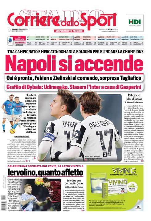 Il Corriere dello Sport, nell'edizione campana, apre con "Napoli si accende". Osi è pronto, Fabian e Zielinski al comando, sorpresa Tagliafico. Spalletti si prepara a lanciare Osimhen nella ripresa: staffetta con Petagna, favorito su Mertens. Fascia sinistra: riprende quota l'idea legata al terzino dell'Ajax.