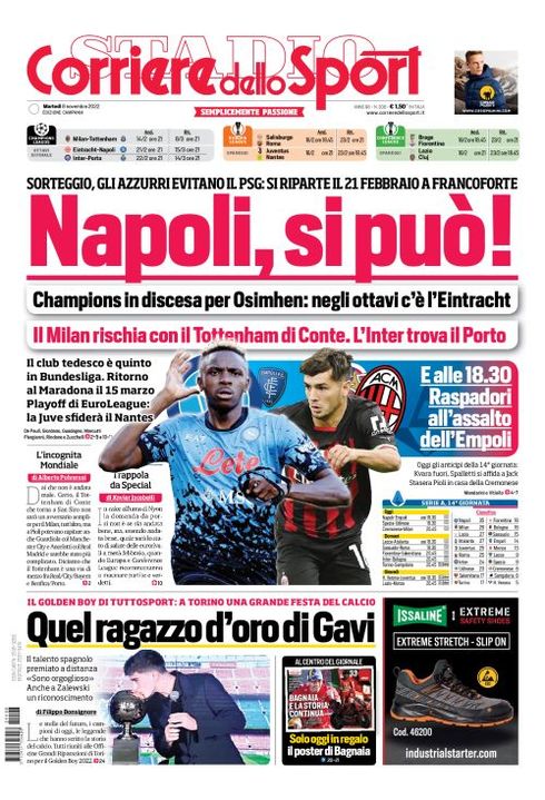 Il Corriere dello Sport, nell'edizione campana, apre con "Napoli, si può!". Sorteggio, gli azzurri evitano il PSG: si riparte il 21 Febbraio a Francoforte. Champions in discesa per Osimhen: negli ottavi c'è l'Eintracht. Il club tedesco è quinto in Bundesliga. Ritorno al Maradona il 15 marzo. E alle 18:30 Raspadori all'assalto dell'Empoli. Oggi gli anticipi della 14^ giornata: Kvara fuori. Spalletti si affida a Jack.