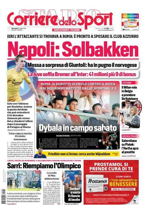 Il Corriere dello Sport, nell'edizione campana, apre parlando dell'interesse da parte del Napoli per Solbakken, attaccante del Bodo/Glimt: "Napoli: Solbakken. Mossa a sorpresa di Giuntoli: ha in pugno il norvegese. Ieri l'attaccante si trovava a Roma: è pronto a sposare il club azzurro. Gelo con l'Udinese per Deulofeu: avanza la punta del Bodo che può svincolarsi il 31 dicembre. Simeone più vicino: DeLa chiuderà l'affare dopo il passaggio di Petagna al Monza".