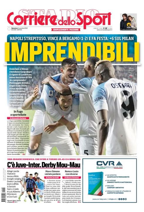 Il Corriere dello Sport, nell'edizione campana, apre con "Imprendibili". Napoli strepitoso, vince a Bergamo (1-2) e fa festa: +6 sul Milan. Osimhen e Elmas stendono Gasp dopo il rigore di Lookman: nono successo di fila in campionato. Messaggio di DeLa dagli Stati Uniti: "Una squadra straordinaria". Spalletti carica: "Forti anche senza Kvara". Giroud piega lo Spezia (2-1).