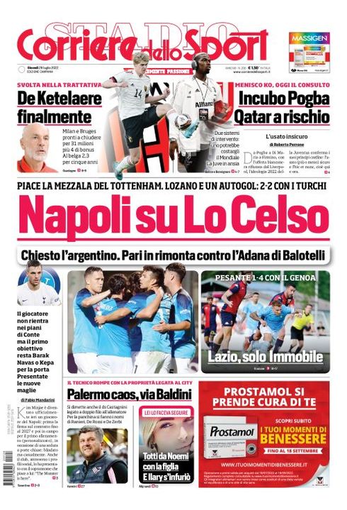 Il Corriere dello Sport, edizione Campania, ha dedicato spazio in prima pagina al Napoli: "Napoli su Lo Celso. Chiesto l'argentino. Pari in rimonta contro l'Adana di Balotelli. Piace la mezzala del Tottenham. Lozano e un autogol: 2-2 con i turchi".