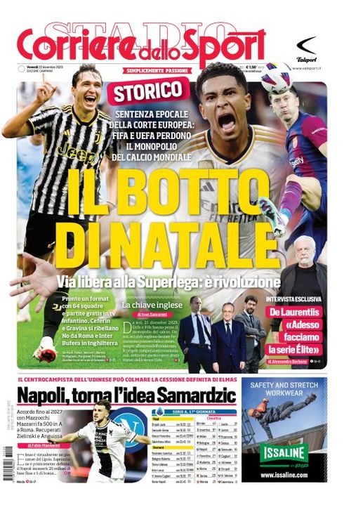 Il Corriere dello Sport, nell'edizione campana apre con "Il botto di Natale". Sentenza epocale della Corte Europea: FIFA e UEFA perdono il monopolio del calcio mondiale. Via libera alla Superlega: è rivoluzione. Pronto un format con 64 squadre e partite gratis in tv. Infantino, Ceferin e Gravina si ribellano. No da Roma e Inter. Bufera in Inghilterra. Intervista esclusiva al presidente del Napoli, Aurelio De Laurentiis: "Adesso facciamo la serie Elite". In basso "Napoli, torna l'idea Samardzic". Il centrocampista dell'Udinese può colmare la cessione definitiva di Elmas. Accordo fino al 2027 con Mazzocchi. Mazzarri fa 500 in A a Roma. Recuperati Anguissa e Zielinski. Infine, il programma della 17esima giornata di Serie A e la classifica.