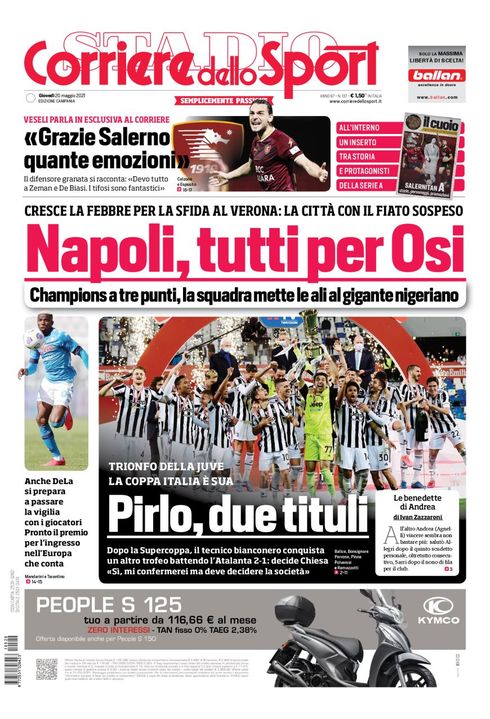 "Napoli, tutti per Osi", titola così la prima pagina del quotidiano Il Corriere dello Sport nella sua edizione Campania. "Cresce la febbre per la sfida al Verona: la città con il fiato sospeso. Champions a tre punti, la squadra mette le ali al gigante nigeriano. Anche DeLa si prepara a passare la vigilia con i giocatori. Pronto il premio per l'ingresso nell'Europa che conta".