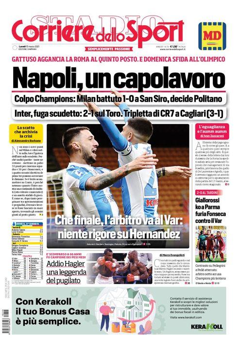 Il Corriere dello Sport, nella sua edizione Campania, commenta così il successo del Napoli contro il Milan: "Napoli, un capolavoro. Colpo Champions, Milan battuto 1-0 a San Siro, decide Politano. Che finale l'arbitro va al Var: niente rigore su Hernandez", poi: "Giallorossi ko a Parma, furia Fonseca contro il Var".