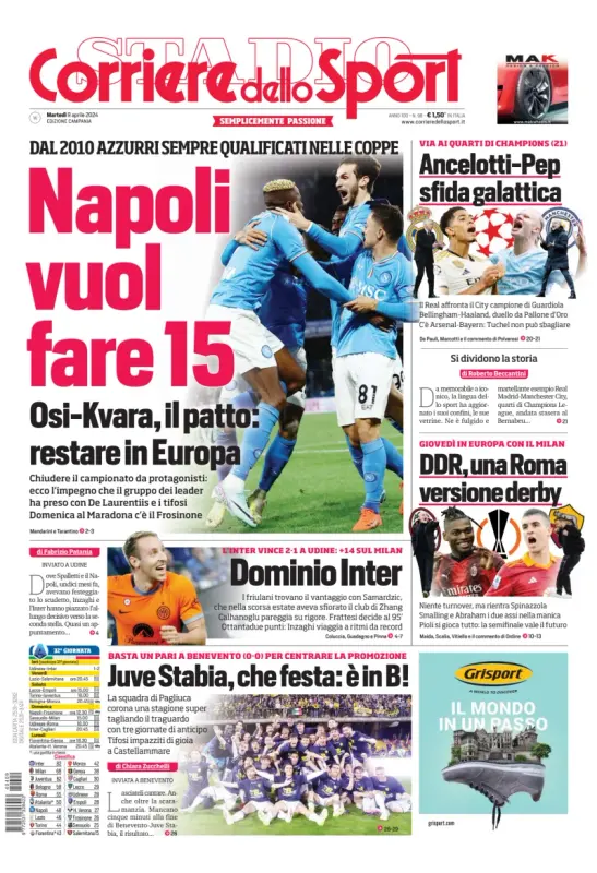 Il Corriere dello Sport, nell'edizione campana, apre con "Napoli vuol fare 15". Dal 2010 azzurri sempre qualificati nelle coppe. Osi-Kvara, il patto: restare in Europa. Chiudere il campionato da protagonisti: ecco l'impegno che il gruppo dei leader ha preso con De Laurentiis e i tifosi. Domenica al Maradona c'è il Frosinone. Spazio anche a "Dominio Inter", "DDR, una Roma versione derby" e "Juve Stabia, che festa: è il B!". Poi, la grande sfida dell'andata dei quarti di finale di Champions League tra Real Madrid e Manchester City "Ancelotti-Pep, sfida galattica". Infine, la classifica e i risultati dopo la 31esima giornata di Serie A.
