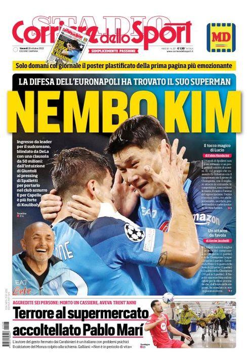 Il Corriere dello Sport, nell'edizione campana, apre con "Nembo Kim". La difesa dell'EuroNapoli ha trovato il suo superman. Ingresso da leader per il sudcoreano, blindato da DeLa con una clausola da 50 milioni: dall'intuizione di Giuntoli al pressing di Spalletti per portarlo nel club azzurro. E per Capello è più forte di Koulibaly. In basso, il dramma nel centro commerciale di Assago: "Terrore al supermercato, accoltellato Pablo Marì".