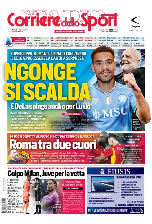 Il Corriere dello Sport, nell'edizione campana, apre con "Ngonge si scalda". Supercoppa, domani la finale con l'Inter, il belga può essere la carta a sorpresa. E De Laurentiis spinge per Lukic. Nuovi contatti con il Fulham per il serbo (pupillo di Mazzarri) e per Mangala del Nottingham. Popovic ha fatto le visite. Il presidente carica: "Mai avuto dubbi sul valore della squadra". Spazio anche alle vittorie di Roma "Roma tra due cuori" e Milan "Colpo Milan, Juve per la vetta! Pioli vince 3-2 a Udine al 93', cori razzisti a Maignan: stop di 5'". In alto, il programma della 21esima giornata di Serie A e la classifica.