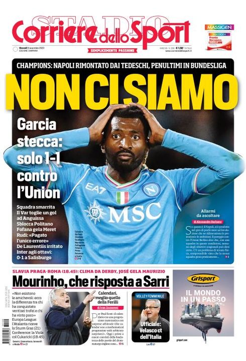 Il Corriere dello Sport, edizione Campania, ha dedicato spazio al Napoli e al pareggio in Champions League contro l'Union Berlino: "Non ci siamo. Champions: Napoli rimontato dai tedeschi, penultimi in Bundesliga. Garcia stecca: solo 1-1 contro l'Union".