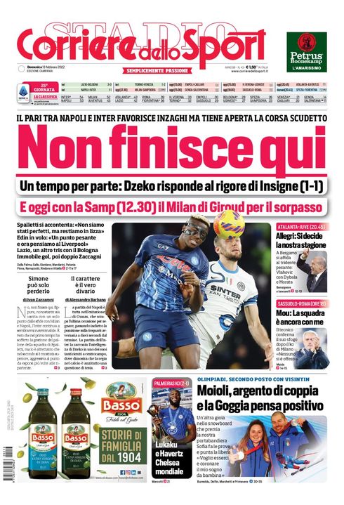 Il Corriere dello Sport, nell'edizione campana, apre con il pareggio tra Napoli ed Inter: "Non finisce qui. Il pari tra Napoli e Inter favorisce Inzaghi ma tiene aperta la corsa scudetto. Un tempo per parte: Dzeko risponde al rigore di Insigne (1-1). E oggi con la Samp (12.30) il Milan di Giroud per il sorpasso".