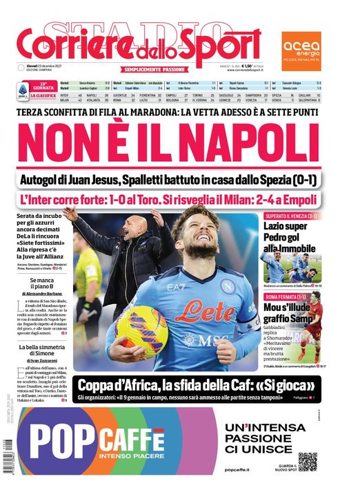 Il Corriere dello Sport, edizione Campania, dedica la prima pagina alla sconfitta interna del Napoli contro lo Spezia, nell'ultimo match di Serie A del 2021: "Non è il Napoli. Terza sconfitta di fila al Maradona: la vetta adesso è a sette punti. Autogol di Juan Jesus, Spalletti battuto in casa dallo Spezia (0-1)". C'è spazio anche per l'Inter, capolista e il Milan, attualmente secondo in classifica: "L'Inter corre forte: 1-0 al Toro. Si risveglia il Milan: 2-4 all'Empoli".