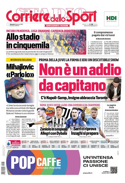 Il Corriere dello Sport, nell'edizione campana, apre con il passaggio al Toronto di Lorenzo Insigne: "Non è un addio da capitano". Prima della Juve la firma e ieri un discutibile show. C'è Napoli-Samp, Insigne abbraccia il Toronto. Intervista esclusiva a Sinisa Mihajlovic: "Parlo io". In alto l'incubo della pandemia, Lega unanime: "Capienza ridotta. Allo stadio in cinquemila".