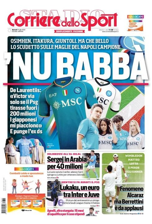 Il Corriere dello Sport, nell'edizione campana, apre con "'Nu babbà". Osimhen, Itakura, Giuntoli. Ma che bello lo Scudetto sulle maglie del Napoli campione. De Laurentiis: "Victor via solo se il PSG tirasse fuori 200 milioni. I giapponesi mi piaccioni". E punge l'ex d.s.