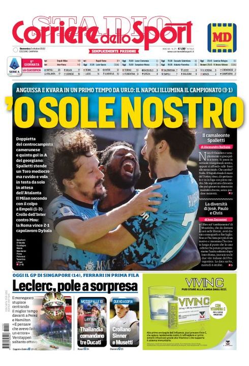 Il Corriere dello Sport, nell'edizione campana, apre con "'O sole nostro". Anguissa e Kvara in un primo tempo da urlo: il Napoli illumina il campionato (3-1). Doppietta del centrocampista camerunense e quinto gol in A del georgiano: Spalletti stende un Toro mediocre ma ruvido e vola in testa da solo in attesa dell'Atalanta. Il Milan secondo con il colpo a Empoli (1-3). Crollo dell'Inter contro Mou: la Roma vince 2-1, capolavoro Dybala.