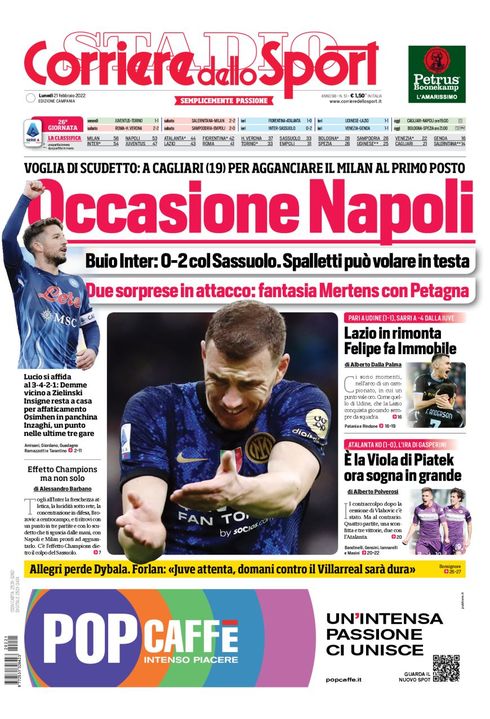 Il Corriere dello Sport, edizione Campania, ha dedicato spazio in prima pagina al Napoli che sfiderà il Cagliari nel "Monday Night" di Serie A: "Occasione Napoli. Voglia di Scudetto: A Cagliari (19) per agganciare il Milan al primo posto. Buio Inter: 0-2 col Sassuolo. Spalletti può volare in testa. Due sorprese in attacco: fantasia Mertens con Petagna".