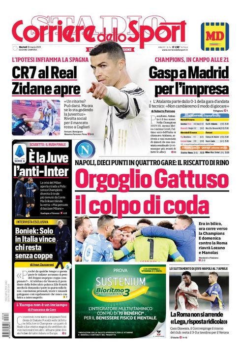 "Orgoglio Gattuso, il colpo di coda", questo è il titolo di apertura della prima pagina del quotidiano Il Corriere dello Sport nella sua edizione Campania, oggi in edicola. "Napoli, dieci punti in quattro gare: il riscatto di Rino. Era in bilico, ora corre verso la Champions e domenica contro la Roma riavrà Lozano e Manolas".