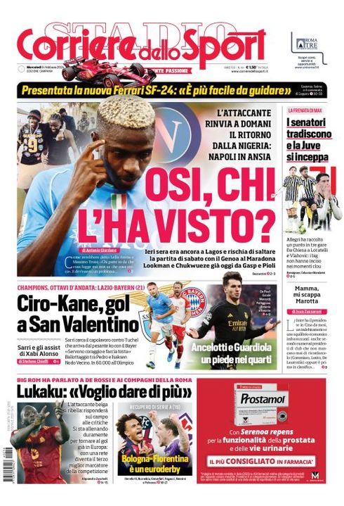 Il Corriere dello Sport, nell'edizione campana, apre parlando dell'attaccante azzurro Victor Osimhen: "Osi, chi l'ha visto? L'attaccante rinvia a domani il ritorno dalla Nigeria: Napoli in ansia. Ieri sera era ancora a Lagos e rischia di saltare la partita di sabato con il Genoa al Maradona. Lookman e Chukwueze già oggi da Gasp e Pioli".