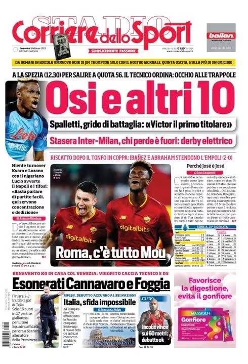 Il Corriere dello Sport, nell'edizione campana, apre con "Osi e altri 10". A La Spezia (12.30) per salire a quota 56. Il tecnico ordina: occhio alle trappole. Spalletti, grido di battaglia: "Victor il primo titolare". Niente turnover, Kvara e Lozano con il nigeriano. Lucio avverte il Napoli e i tifosi: "Basta parlare di partite facili, qui servono concentrazione e dedizione".