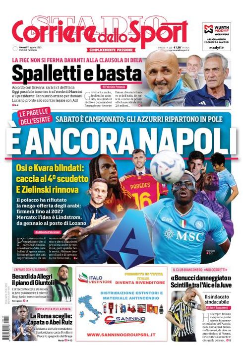 Il Corriere dello Sport, edizione Campania, ha dedicato spazio in prima pagina al Napoli e all'inizio del campionato: "E' ancora Napoli. Sabato è campionato: gli azzurri ripartono in pole. Osi e Kvara blindati: caccia al 4° scudetto e Zielinski rinnova".