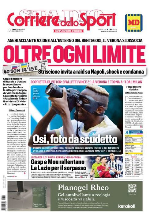 Il Corriere dello Sport, edizione Campania, ha dedicato la prima pagina alla vittoria del Napoli contro il Verona in campionato: "Osi, foto da scudetto. Doppietta di Victor: Spalletti vince 2-1 a Verona e torna a -3 dal Milan". C'è spazio anche per lo striscione esposto da alcuni tifosi del Verona: "Oltre ogni limite. Agghiacciante azione all'esterno del Bentegodi, il Verona si dissocia. Striscione invita a raid su Napoli, shoc e condanna".