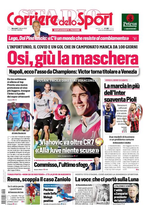 Il Corriere dello Sport, nell'edizione campana, apre con il rientro in campo a pieno regime dell'attaccante azzurro Victor Osimhen: "Osi, giù la maschera. Napoli, ecco l'asso da Champions: Victor torna titolare a Venezia. L'infortunio, il Covid e un gol che in campionato manca da 108 giorni".
