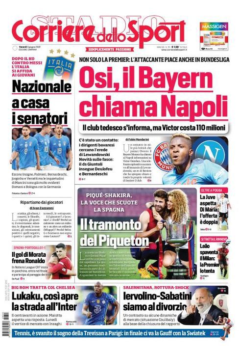Il Corriere dello Sport, nell'edizione campana, apre con "Osi, il Bayern chiama Napoli". Non solo la Premier: l'attaccante piace anche in Bundesliga. Il club tedesco s'informa, ma Victor costa 110 milioni. C'è stato un contatto: i dirigenti bavaresi cercano l'erede di Lewandowski. Novità sulle fasce: il ds Giuntoli insegue Deulofeu e Bernardeschi.
