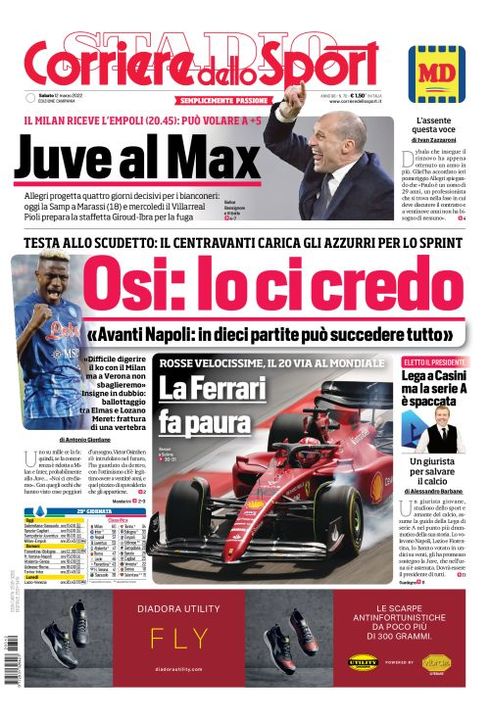 Il Corriere dello Sport, nell'edizione campana, apre con le parole del centravanti azzurro Victor Osimhen: "Io ci credo. Avanti Napoli: in dieci partite può succedere tutto". Testa allo scudetto: il centravanti carica gli azzurri per lo sprint.