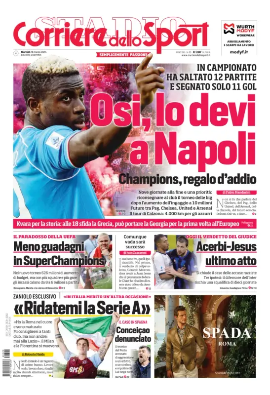 Il Corriere dello Sport, nell'edizione campana, apre con "Osi, lo devi a Napoli". In campionato ha saltato 12 partite e segnato solo 11 gol. Champions, regalo d'addio. Nove giornate alla fine e una priorità: riconsegnare al club il torneo delle big, dopo l'aumento dell'ingaggio a 10 milioni. Futuro tra PSG, Chelsea, United e Arsenal. Il tour di Calzona: 4.000 km per gli azzurri. Poi, "Kvara per la storia: alle 18 sfida la Grecia, può portare la Georgia per la prima volta all'Europeo". Spazio anche a "Meno guadagni in SuperChampions" e "Acerbi-Jesus, ultimo atto". In basso, l'intervista a Nicolò Zaniolo: "Ridatemi la Serie A" e "Conceiçao denunciato".