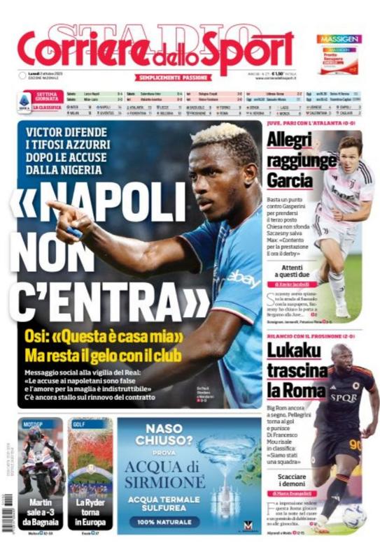 Il Corriere dello Sport, edizione Campania, dedica spazio in prima pagina al Napoli e al messaggio di Osimhen: "Napoli non c'entra" Osi: "Questa è casa mia". Ma resta il gelo con il club. Victor difende i tifosi azzurri dopo le accuse dalla Nigeria".