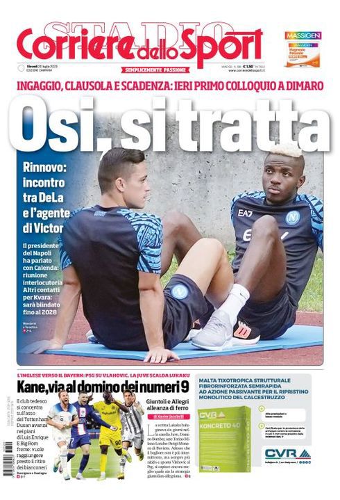 Il Corriere dello Sport, edizione Campania, dedica spazio in prima pagina al Napoli e a Victor Osimhen: "Osi, si tratta. Ingaggio, clausola e scadenza: ieri primo colloquio a Dimaro. Rinnovo: incontro tra DeLa e l'agente di Victor".