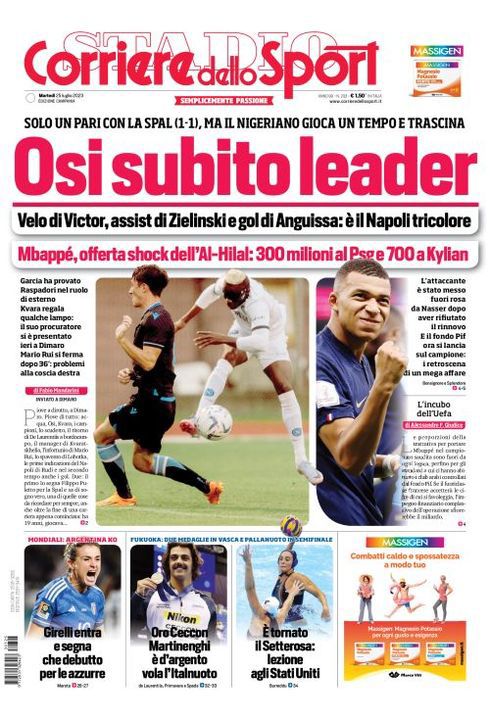Il Corriere dello Sport, nell'edizione campana, apre parlando dell'amichevole tra Napoli e Spal terminata 1-1 in cui ha fatto il suo esordio stagionale Victor Osimhen: "Osimhen subito leader. Solo un pari con la Spal (1-1), ma il nigeriano gioca un tempo e trascina. Velo di Victor, assist di Zielinski e gol di Anguissa: è il Napoli tricolore. Garcia ha provato Raspadori nel ruolo di esterno. Kvara regala qualche lampo: il suo procuratore si è presentato ieri a Dimaro. Mario Rui si ferma dopo 36': problemi alla coscia destra".