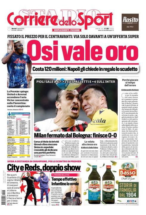 Il Corriere dello Sport, nell'edizione campana, apre con "Osi vale oro". Fissato il prezzo per il centravanti: via solo davanti a un'offerta super. Costa 120 milioni: Napoli gli chiede in regalo lo scudetto.