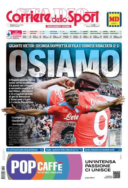 Il Corriere dello Sport, nell'edizione campana, apre con la vittoria del Napoli contro l'Udinese arrivata in rimonta grazie alla seconda doppietta consecutiva di Victor Osimhen: "Osiamo. Gigante Victor: seconda doppietta di fila e Udinese ribaltata (2-1). Il Napoli prende forza nella corsa scudetto: 24 punti nel ritorno e secondo posto a -3 dal Milan, che vince 1-0 a Cagliari grazie al gol di Bennacer. L'Inter non c'è più: 1-1 con la Fiorentina".