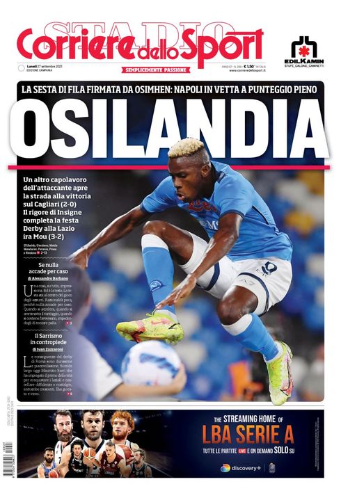 Il Corriere dello Sport, nell'edizione Campania, apre in prima pagina con gli azzurri: "Osilandia. La sesta di fila firmata da Osimhen. Napoli in vetta a punteggio pieno. Un altro capolavoro dell'attaccante apre la strada alla vittoria sul Cagliari (2-0). Il rigore di Insigne completa la festa".