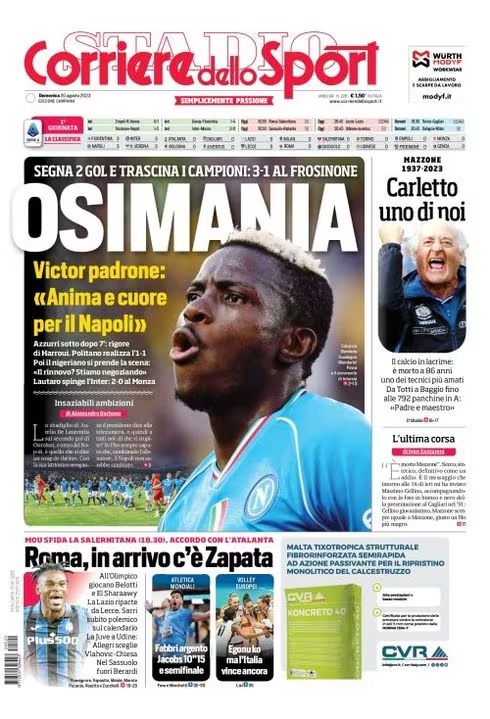 Il Corriere dello Sport, nell'edizione campana, apre con "Osimania". Segna 2 gol e trascina i campioni: 3-1 al Frosinone. Victor padrone: "Anima e cuore per il Napoli". Azzurri sotto dopo 7': rigore di Harroui. Politano realizza l'1-1. Poi il nigeriano si prende la scena: "Il rinnovo? Stiamo negoziando". Lautaro spinge l'Inter: 2-0 al Monza.