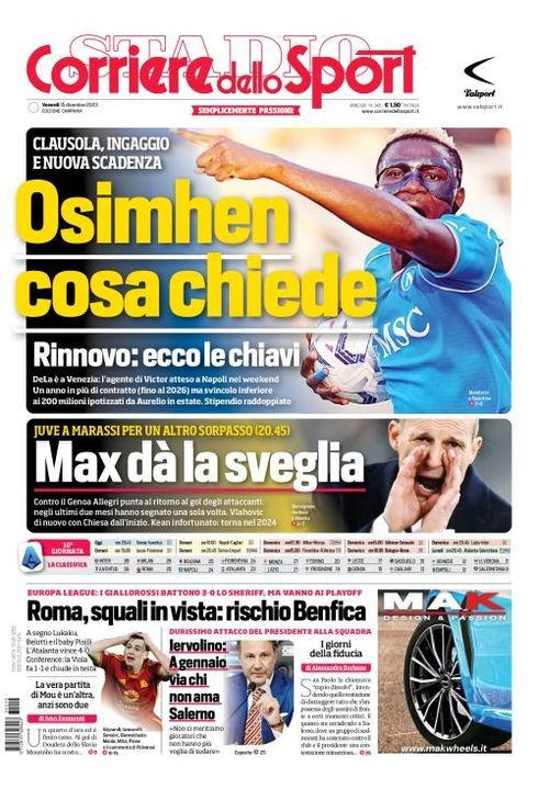 Il Corriere dello Sport, nell'edizione campana, apre con "Osimhen cosa chiede". Clausola, ingaggio e nuova scadenza. Rinnovo: ecco le chiavi. De Laurentiis è a Venezia: l'agente di Victor atteso a Napoli nel weekend. Un anno in più di contratto (fino al 2026), ma svincolo inferiore ai 200 milioni ipotizzati da Aurelio in estate. Stipendio raddoppiato. Spazio anche alla Juventus con "Max dà la sveglia", alla Roma con "squali in vista: rischio Benfica" e la Salernitana con le parole di Iervolino: "A gennaio via chi non ama Salerno".